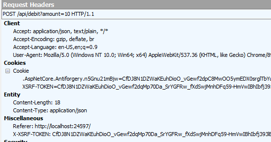 When the anti-forgery validation is in action, you will receive a 400 bad request error, and this is expected because the ASP.NET Core engine cannot find the CSRF token header.